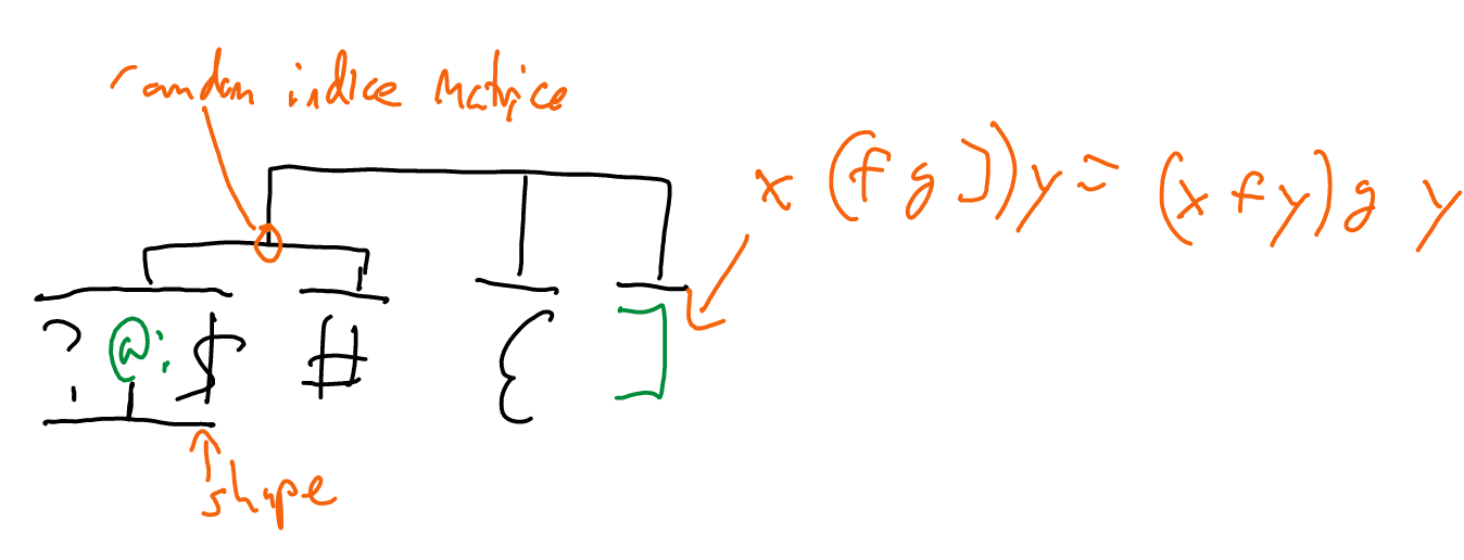 With all of these pieces, we can express the problem as “find the length of y, initialize a matrix of shape x filled with len, randomize every cell to an integer between 0 and len, then use the random numbers as indices against y.” The binary tree for our random matrix verb looks like this: