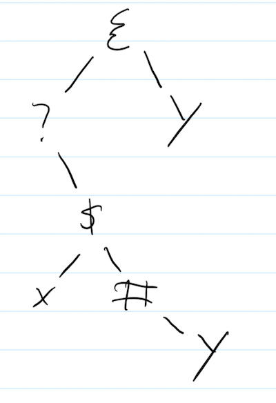 We saw being able to sketch our call trees helped us write a tacit verb. But can we also use drawings to read them? I think so. (?@:$#){] Is monospaced, using symbols that don’t carry a lot of semantic meaning. We can use annotations, markups, and different colors to make it more legible. Step one, let’s remove the parenthesis and annotate which verbs form a hook and which form a fork.