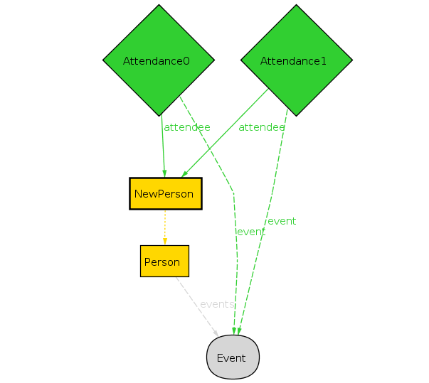 For the new schema, we want separate instances for attendance and reviews. To make things easier, we’ll create a NewPerson signature that points at an existing Person.